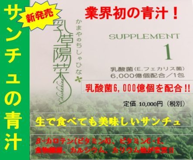業界初のサンチュの青汁サプリメント!研究から生まれた体イキイキのために乳酸菌(E.フェカリス菌)6,000臆を配合!試行錯誤を重ねて誕生した、初めてのサンチュのサプリメント。体の芯からイキイキする本物の美と健康を、充実した毎日をサポートします。生の食べてもおいしいサンチュ、焼肉には欠かせない葉野菜として、たっぷりの食物繊維はコレストロールコントロールに欠かせません。また、βカロチン豊富なスーパーフードです。国内水耕栽培、手摘みの「かまや」のサンチュ。そもそも乳草とは、葉や茎を切ると、乳のように白い液を出す草木の総称。レタスなどの葉物野菜、そしてサンチュも乳草の一種です。平成11年の創業以来、国内サンチュ栽培ひと筋の「かまや」が育てる、安心・安全でおいしいこだわりのサンチュを、太陽をさんさんと浴びて次々と葉を出す、生命力あふれる姿そのままに「太陽の恵の葉」として名づけ育てています。