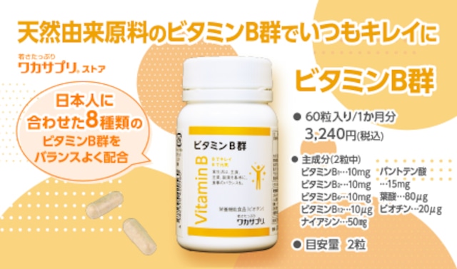 ドクターが監修の高品質なサプリメントです。1カプセルに8種類のビタミンを配合しております。素敵女医が飲んでいるサプリBEST10、原材料に吸収性にすぐれた酵母、植物抽出物由来のビタミンを使用しております。ビタミンバランスを考慮し、日本人の栄養状態に合わせた理想的な配合量で処方、ビタミンB群(60粒入り) 24.0g(60粒:1粒重量400mg、1粒内容量330mg) 原材料名 澱粉、酵母(ビタミンB3ナイアシンアミド含有)、酵母(パントテン酸含有)、酵母(ビタミンB6含有)、酵母(ビタミンB1含有)、酵母(葉酸含有)、酵母(ビオチン含有)、酵母(ビタミンB12含有)、HPMC、微粒二酸化ケイ素、ビタミンB2、ステアリン酸カルシウム ※2粒中(800mg)被包材を含む エネルギー:2.96kcal / たんぱく質:0.25g / 脂質:0.01g / 炭水化物:0.46g / ナトリウム:0.88mg / ビタミンB1:10mg / ビタミンB2:10mg / ビタミンB6:10mg / ビタミンB12:10μg / B3ナイアシン:50mg / パントテン酸:15mg / ビオチン:20μg / 葉酸:80μg ビタミンやミネラルは、直接的なエネルギーにはなりませんが、身体の新陳代謝に欠かせない成分です。食事で万遍無く摂取するのは難しいです、サプリメントで毎日補給することをお薦めします!