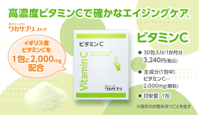 ビタミンCは、免疫力を高めストレスからも守ってくれます、また肌に大事なコラーゲンの吸収を助成してくれます!現在市場での合成ビタミンCの原材料の95%は中国産です。ワカサプリは安全性の高いイギリス製のビタミンCをわざわざ使用しています。そのために医療関係者からもご使用して頂いております。本製品1包にビタミンCが2,000mg レモン約100個分!ビタミンC(30包入り)ワカサプリでは、成分を最大量で提供するために粉状にしてご提供しています。ビタミンCは摂りすぎても対外に排出することができ、むしろ不足することのほうが心配となります。ちなみに煙草1本吸うとレモン約4個分のビタミンCが体内で消費されます。 62.4g(1包2.08g×30包) 原材料名 ビタミンC、グァーガム、デキストリン ※1包中(2.08g)被包材を含む エネルギー:8.3kcal/たんぱく質:0.00g/脂質:0.00g/炭水化物:2.08g/ナトリウム:0.00mg/ビタミンC:2,000mg
