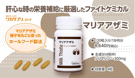 マリアアザミとは、西洋ハーブ、別名「ミルクシスル」と呼ばれ南ヨーロッパ、北アフリカ、アジアに広く分布するキク科の植物です。肝炎ウイルスや医薬品で疲弊した肝機能の再生をサポートするハーブと言われています。お酒をたくさん飲む方、GOP、GDPの数値が高い方、たばこを吸う方、化学物質を扱っている方(有機溶剤のように気化しやすいもの:美容院で使用するパーマ剤など)にお勧めです。ワカサプリのマリアザミサプリメントは植物部位をまるごとつかう「ホールフード」です。これには複数の天然成分が含まれ、独自のバランスが健康や美容に良いと考えられています。種子を丸ごと利用し、優しさと力強さを併せもち、マリアアザミの特長的な成分である 「 シリマリン 」を300mg摂取可能です。