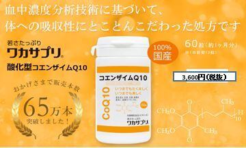 人間細胞の新陳代謝、ミトコンドリアのエネルギー源がコエンザイムQ10です。体内コエンザイムQ10は20代をピークに減っていってしまいます、これがいわゆる老化現象です。ワカサプリは国内いち早く、東大医学博士との開発された物で、100%国産で純度が高く安全な発酵法で作られた、血中濃度分析技術に基づいた処方の酸化型コエンザイムQ10、さらに相性が良く若々しさを助ける大豆由来のビタミンE(天然型ミックストコフェロール)を1粒に5mg配合、コエンザイムQ10(60粒入り)