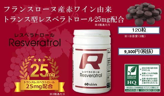 フレンチパラドックスとは、フランス人がコレストロールの高い食事をしているにも関わらず、心疾患の死亡率が低いことを表します。これは山葡萄の果皮に含まれるレスベラトロールの接種量が多いことが理由の一つとなっています。レスベラトロールは植物が体を守るためにつくるポリフェノールの一種です、原材料にフランスローヌ産ワイン由来、トランス型レスベラトロール、Rレスベラトロール(120粒入り)