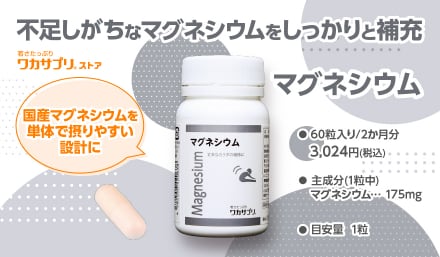 日本人に不足しがちな栄養素をサポート!日本人の成人1日あたりのマグネシウム推奨量は、310~370mgです。しかしながら日本人の平均摂取量は約213mgと低いの現状です。またお酒をよく飲まれる方や利尿薬を飲まれている方は特にマグネシウムが失われやすいです。マグネシウムが不足しカルシウムとのバランスが崩れると、身体に悪影響を及ぼします。カルシウム:マグネシウム比率は、2:1から1:1がお薦めです。国内産原料の酸化マグネシウムを使用、1粒にマグネシウムを175mg配合、マグネシウム(60粒入り)