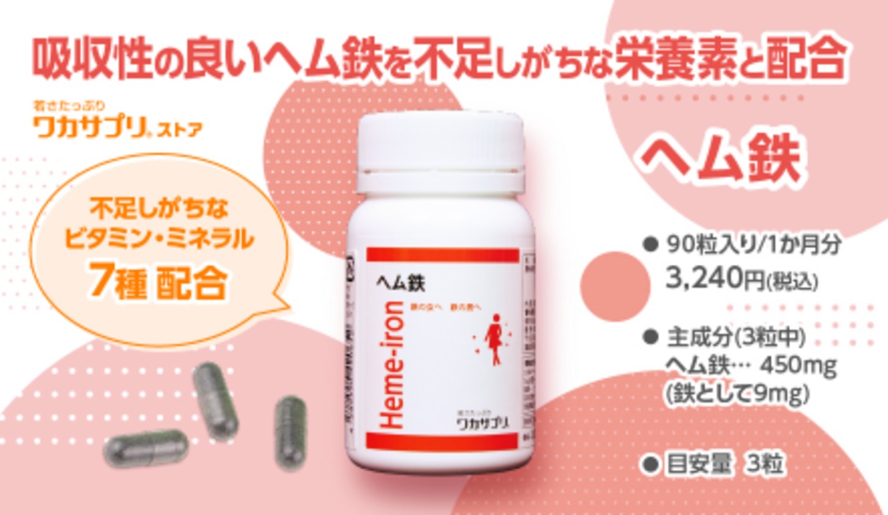鉄分の補給は吸収の良いヘム鉄を!ヘム鉄は動物性食品由来の物で、非ヘム鉄(植物性食品由来)よりも吸収率が高く、胃腸にも優しい鉄分です。また体内で必要量が吸収されるので過剰症の心配がありません。本製品は、胃にも優しいヘム鉄を100%使用(3粒に450mg配合)、ヘム鉄のはたらきを助ける6種類のビタミンとミネラルを独自のバランスで一緒に配合、ヘム鉄(90粒入り)