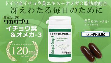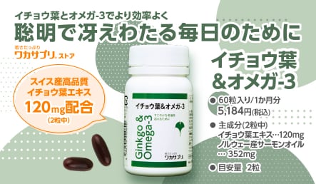 イチョウの葉は、日本からヨーロッパに渡り医薬品として使用されています。イチョウの葉は30種類以上のフラボノイドを含有しており、イチョウの葉のみに含有しているギンコライドは、血管拡張、血液の抗凝固作用をもつと言われています。近年はアルツハイマーや認知症の予防、改善効果に注目されています。本製品では、原材料に医薬品に使用されているドイツ産の高品質イチョウ葉エキス(適正農業規範「GAP」を取得し、無農薬で大切に栽培されたイチョウ葉のみから抽出されたエキスです) 2粒で120㎎、また相性の良いノルウェー産のサーモンオイル 2粒で352㎎(DHA46.2㎎、EPA32.8㎎、DPA8.8㎎)を配合 、イチョウ葉&オメガ-3(60粒入り)