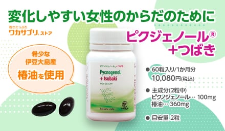 ピクノジェノールとは、フランスの南西部海岸松の樹皮からとった天然の植物抽出物です。フランス海岸松は、海から吹く強い風と年間320日以上が晴天という強い紫外線にさらされた環境で育つため、他の松に比べて樹皮が分厚くなり、多くの抗酸化物質を含みます。本製品のピクノジェノールは、ホーファリサーチ社の商標登録で、肥料や農薬などを一切使用しないで成長した樹齢25年以上のフランス海岸松の樹皮から抽出されます、2粒にピクノジェノールを100mg、伝統的な玉締め法で絞った伊豆大島産の椿油(成分の約86%がオレイン酸(昔から肌に良いとされます))をバランスよく配合、ピクノジェノール+つばき(60粒入り)